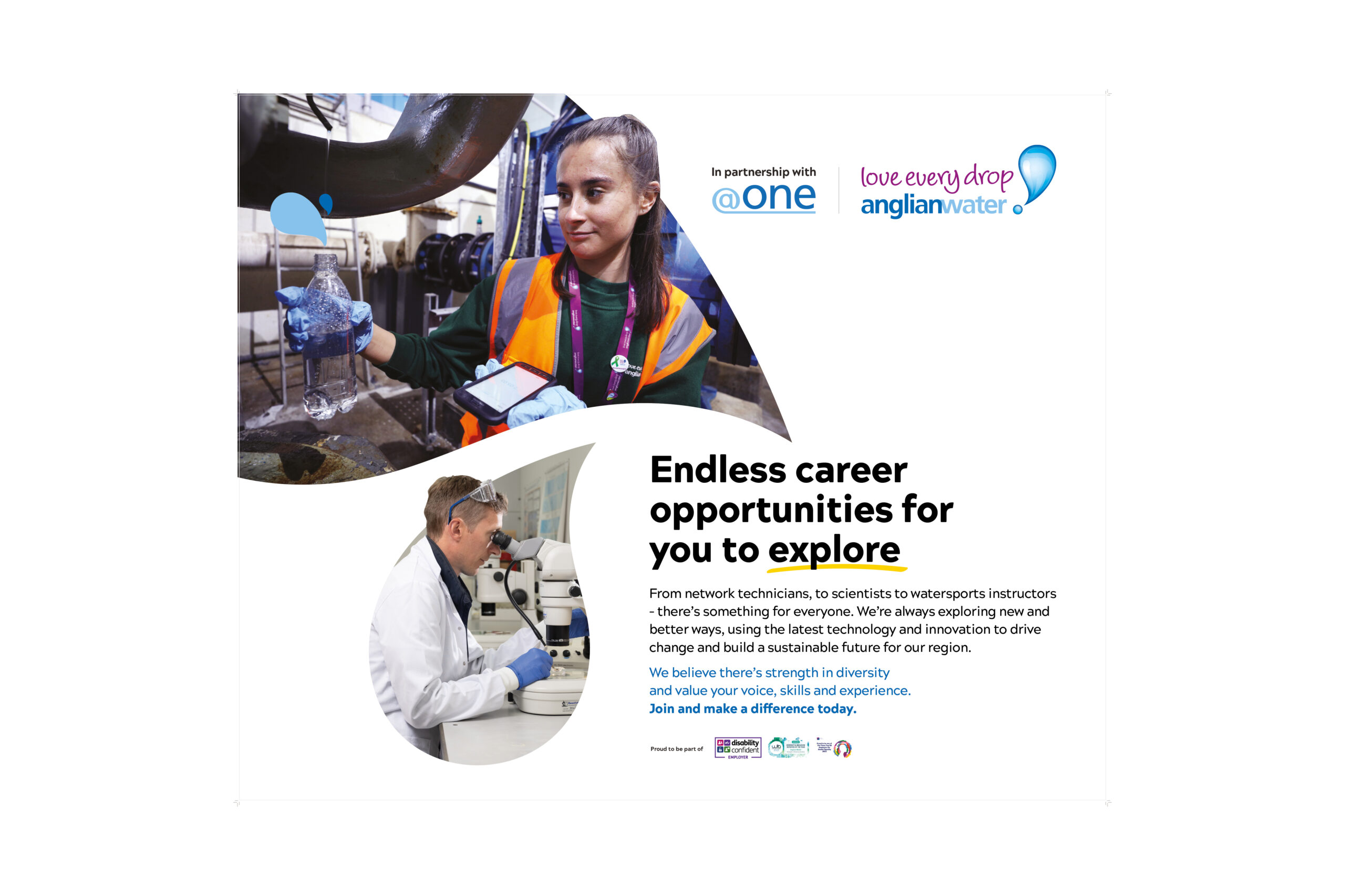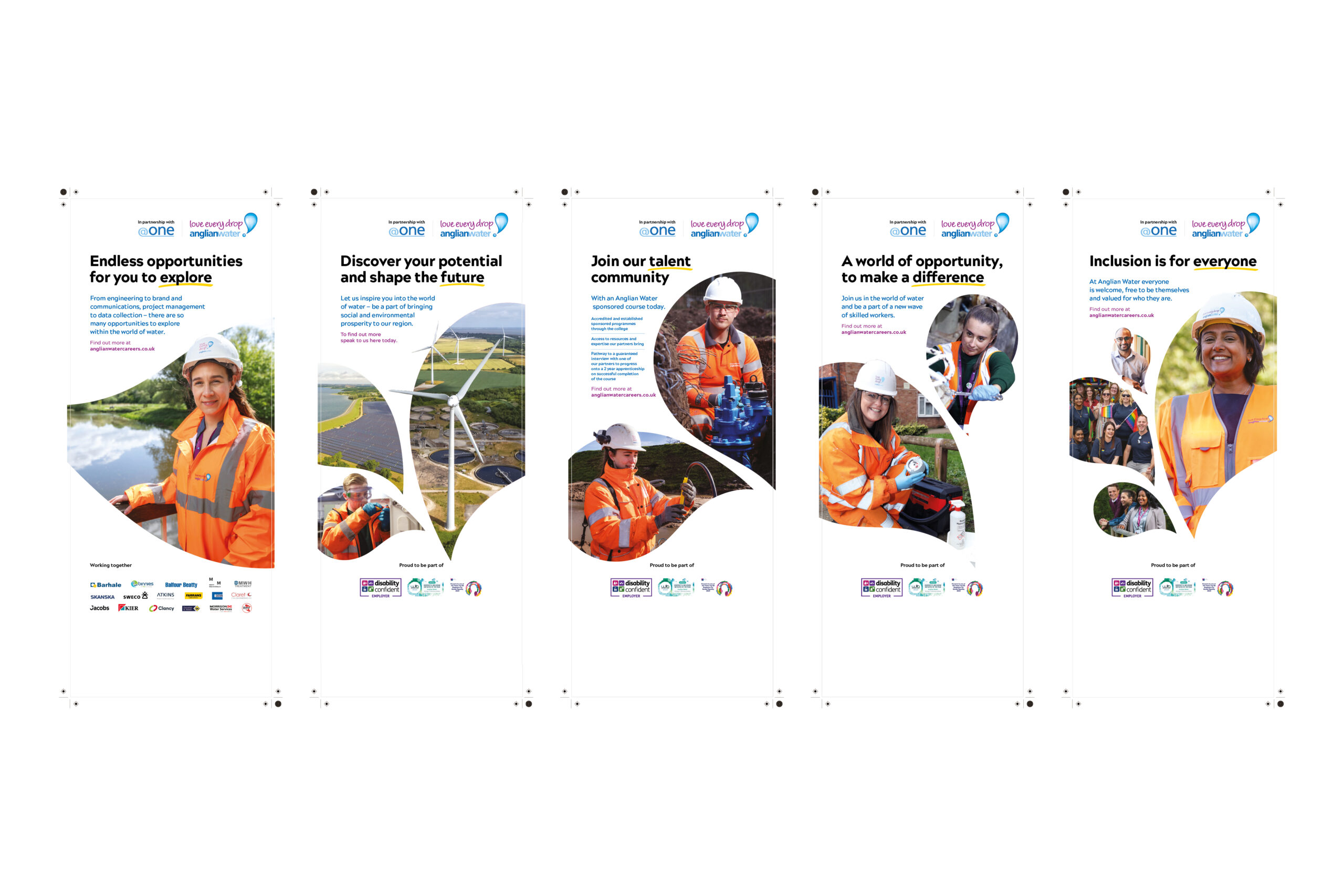 A suite of recruitment assets designed to support Anglian Water’s early careers drive — including pull-up banners for job fairs, LinkedIn banners, Glassdoor advertising, and a digital promotion panel. Aimed at school leavers and future female engineers, the campaign highlights the company’s purpose-driven culture, inclusive opportunities, and commitment to shaping a more sustainable future.